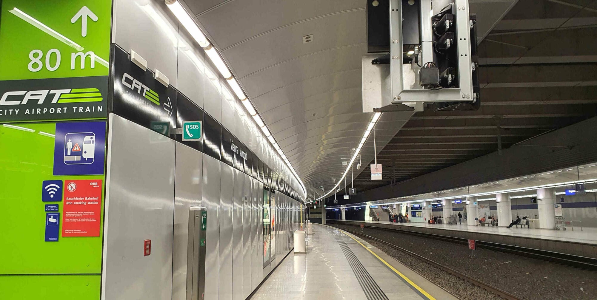 Vlaky CAT zastavují v podzemí letiště pod odbavovací halou. Přitom nádraží Flughafen Wien Bahnhof je společné i pro ostatní vlaky. Abyste se na místě rychle zorientovali, vlaky CAT zastavují u nástupiště označeného zelenou barvou – tedy barvou, která odpovídá jejich vizuálnímu stylu. Stejně tak i ukazatele směru na CAT jsou vyvedeny v zelené barvě.