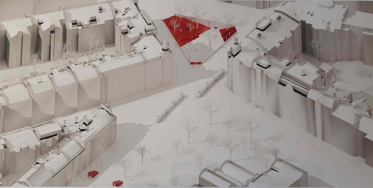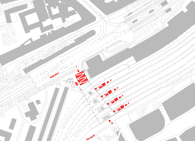 - Návrh zastávky metra Konečného náměstí (Erik Klímant). Vstupy jsou vyznačeny červeně.