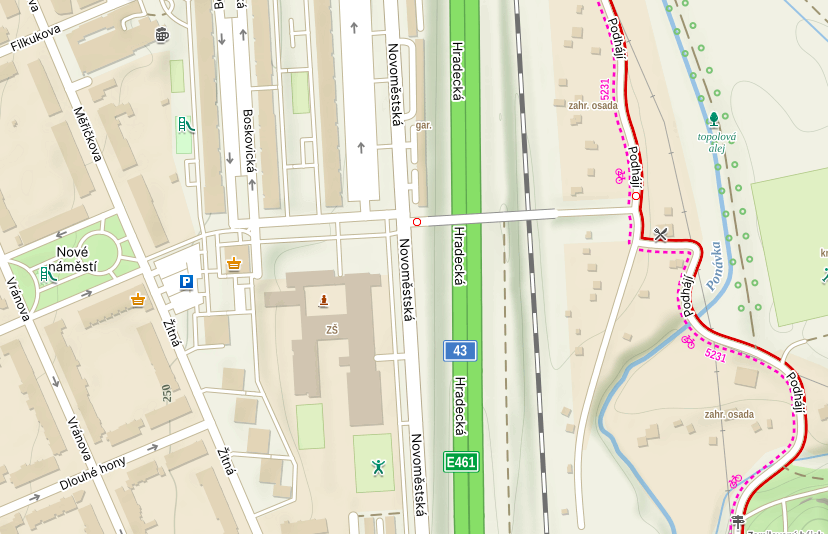 - Křižovatka s mostem přes ulici Hradeckou a železniční trať Tišnov – Brno.