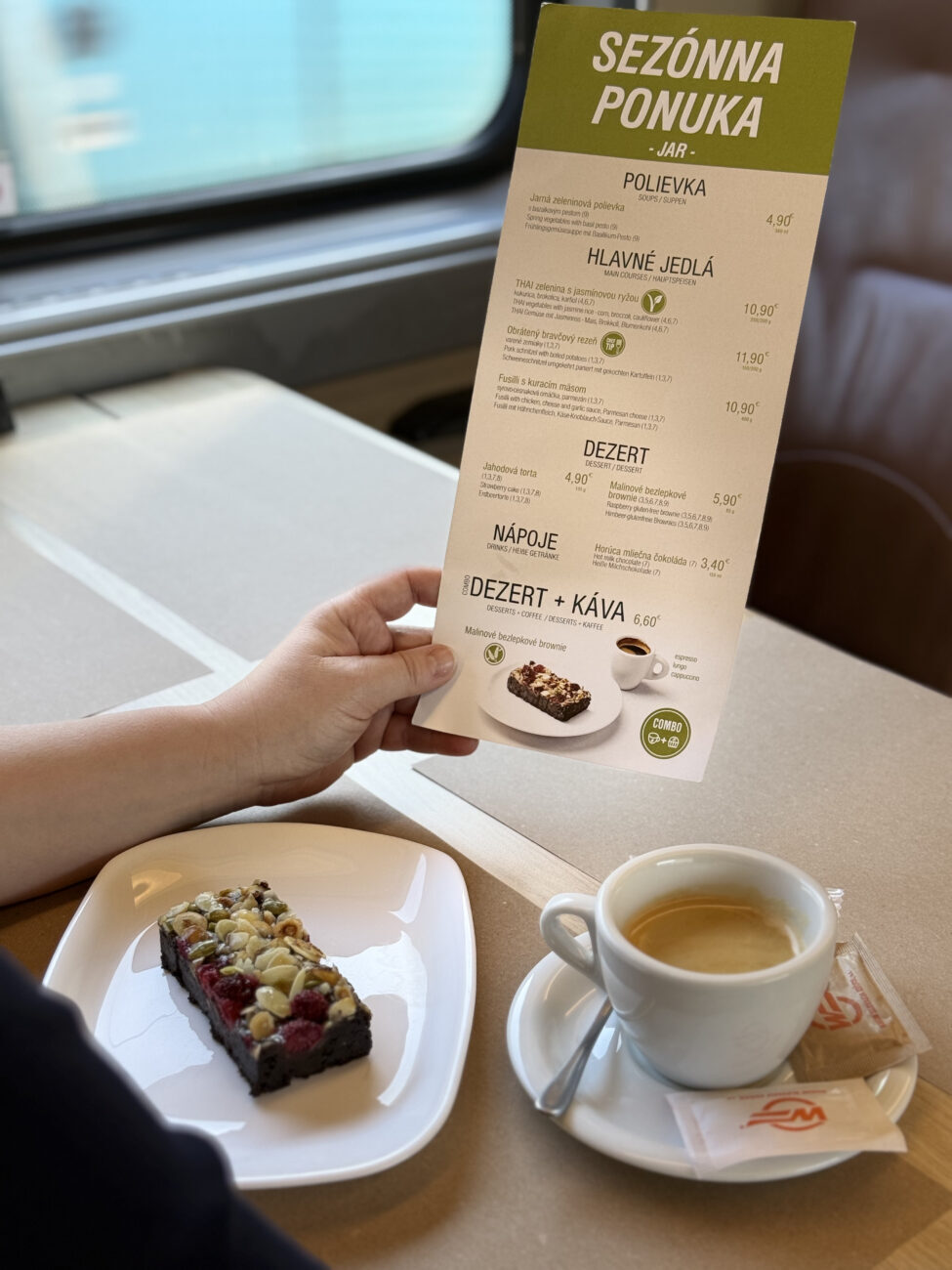 Slovenské jídelní vozy jsou sice k vidění i na trase z Prahy do Bratislavy a do Budapešti, ale v rámci nich je nabídka ČD Restaurant od JLV, a.s. Jedinou možností ochutnat něco ze slovenského jídelního vozu je tedy trasa Bratislava – Žilina – Košice. Možná právě to, že nabídku si nemůžete vyzkoušet v rámci mezinárodních spojení, je důvodem, proč v případě dezertů, ale i jídel, schází originalita, respektive snaha prezentovat místní kuchyni, kterou jde české JLV. Malinové brownie? Jen hluboce zmražený porcovaný cukrářský výrobek, který seženete klidně přes Rohlík. A jinak ho běžně prodává řetězec Ugo, kde ho v případě varianty s kávou seženete za 113 Kč. Jahodový dortík? Opět jen zmražený cukrářský výrobek, který prodává u nás například Tchibo v rámci svých kaváren, kde ho seženete za 69 Kč. Ne že by dezerty nebyly tedy špatné, ale očekával bych více kreativity.
