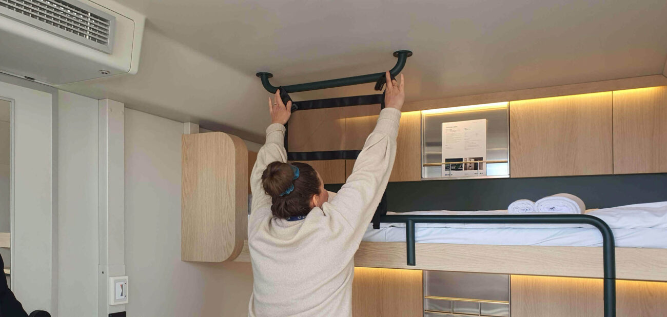 Kabiny jsou buď dvoulůžkové a nebo jsou určeny pro cestování rodin s dětmi. U některých kabin bude součástí vozu vlastní toaleta, některé budou mít i sprchu. Takový model byl právě vystaven – dole jsou dvě místa vedle sebe a horní lůžko je v poloviční šířce, určené právě pro dítě. Tomu odpovídá i menší výška mezi horním lůžkem a stropem. Zajímavostí jsou pevné schody vedoucí nahoru. Protože zábradlí u horní postele je poměrně nízké, předvedla nám paní ze stánku uchycení bezpečnostního popruhu. Rodiče tak mohou dítě uložit a zajištěním popruhem zabránit pádu během jízdy. Lůžka nejsou sklápěcí a nelze je přestavit na sedadla tak, jak jsme od nás zvyklí. V místě, odkud fotím, bude sprcha se záchodem. Dveře vlevo se zámkem a zrcadlem vedou na chodbu vozu.
