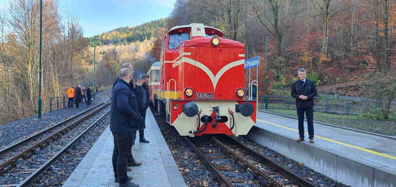Zvláštní vlak ve stanici Dolní Polubný na Kořenovské zubačce u příležitosti znovuzprovoznění tratě po rekonstrukci na podzim 2025