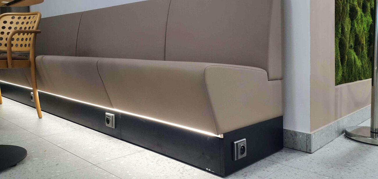 - V přední části je kombinace stolů, židlí a pohovky u stěny. Ta jediná má zásuvky na nabíjení drobné elektroniky.