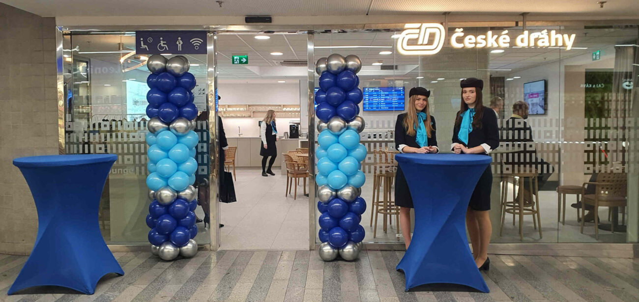 - Slavnostně vyzdobený vchodu při příležitosti znovu otevření ČD Lounge