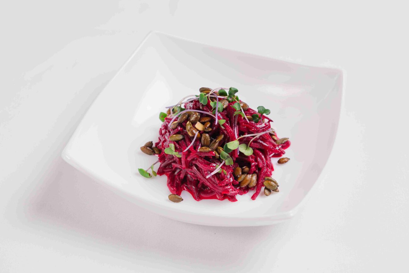 - Salát z červené řepy s dýňovými semínky s javorovým sirupem a microgreens