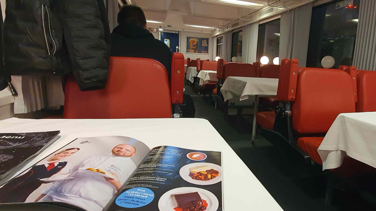 Svoji dnešní cestu začínám v Brně v 6:22 v jídelním voze expresu EC 271 Metropolitan, který směřuje do Budapešti. Vlak je přistaven v Brně u 5. nástupiště, a tak do jídelního vozu ČD vstupuju už dvě minuty před odjezdem. Nejsem prvním cestujícím. Už tu sedí jeden pán a listuje se v menu.