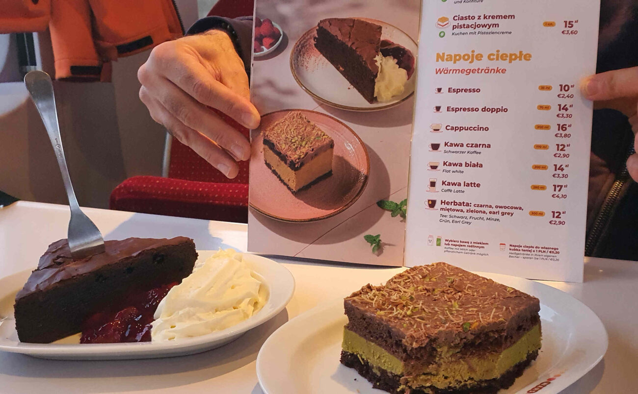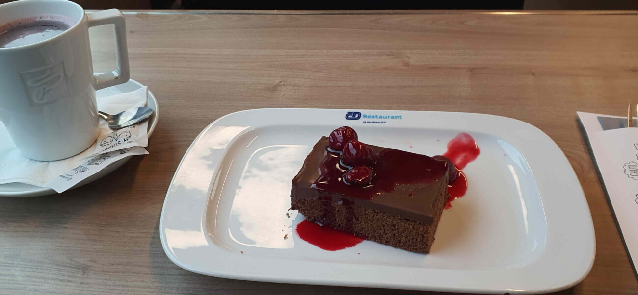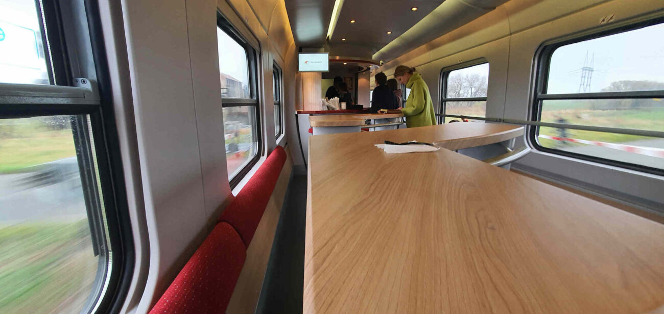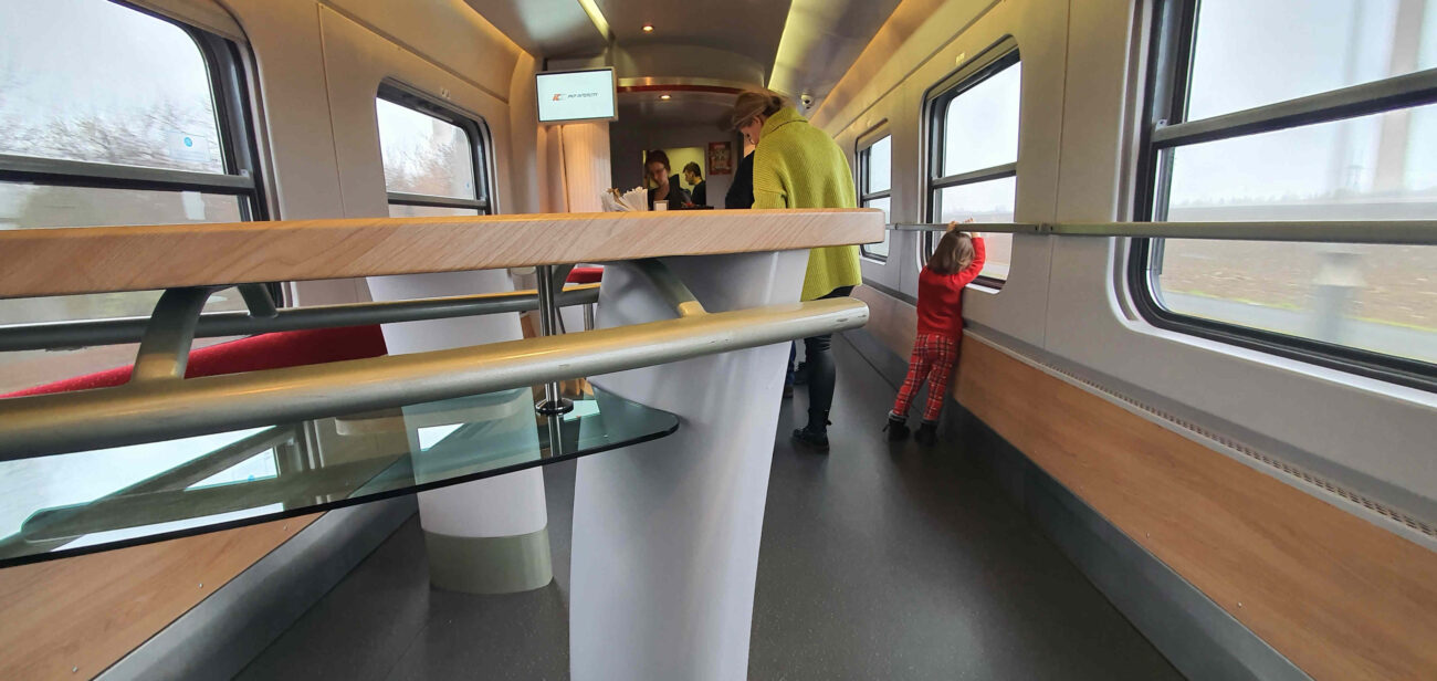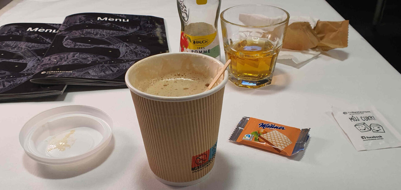 Po rozpačité zkušenosti z polského jídelního vozu jsem za servis v ComfortJet rád. Než vystoupím, začíná se v restauraci měnit směna cestujících: jedni odcházejí, noví přicházejí. Zdá se, že většina se tu stavuje hlavně na snídani nebo sladkosti. Já oceňuji zejména rychlost obsluhy a milý, vstřícný přístup.