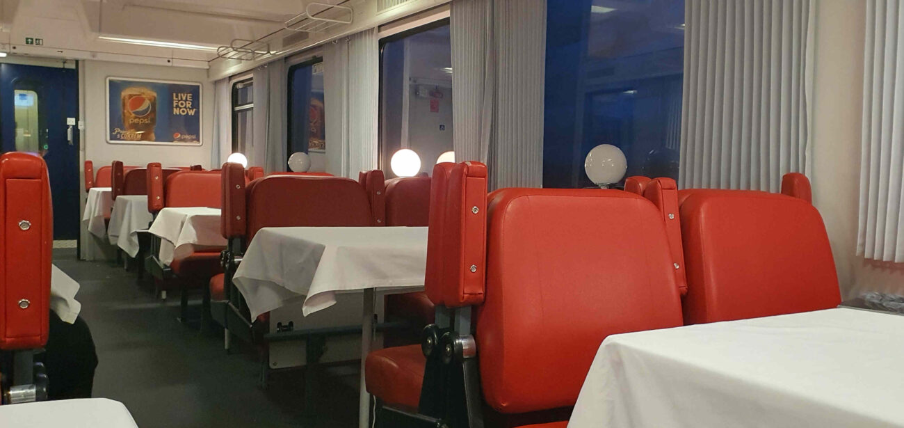 V jídelním voze bych klidně pobyl déle a možná si ještě něco dal, ale je tu hrozná zima. Mám na sobě svetr a v sobě vydatnou snídani, ale tady být je o zdraví. Platím kartou na baru a jdu se přes skoro prázdný setmělý jídelní vůz vrátit na své místo k sezení. Na stolech je neodnesení nádobí.