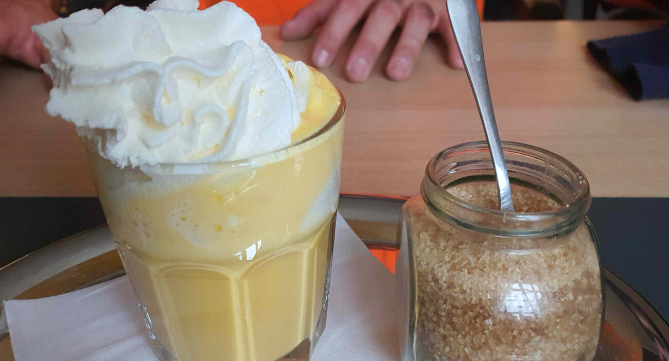 Nevýhodou Lokálky je, že tu nejsou zásuvky na 230 V, a tak se už s kolegou přesouváme do druhé části, kde se u jednoho stolu — se svolením obsluhy — připojujeme k prodlužovačce, abychom doplnili elektřinu. Dávám si kávu a Míra čokoládu ve stylu bombardino. Je bez alkoholu, ale je chutná a dal by si ji klidně znovu.