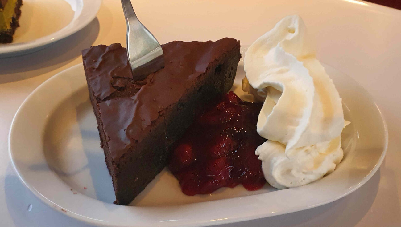 Překvapivě napřed přinesli zákusky, až poté polévku, ale nu což. Krémová polévka je výborná. Pistáciový zákusek a lá Dubai je excelentní. Jediná výtka je ta, že je trochu tužší, a tak by host místo vidličky uvítal i jídelní nůž na krájení. V puse se ale sousto rozplývá a chuťově je to nejlepší zákusek dnešního výletu. Tento zákusek opravdu doporučujeme. Brownie se šlehačkou a džemem je sice dobré, ale žádný zázrak, který by překvapil, to není. Není prostě tak dobrý jako ten na palubě ČD ComfortJet.