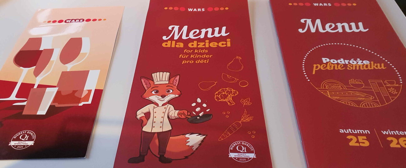 Součástí nového menu polského WARSu je i nabídka zapékanek, což jsou zapečené obložené bagety, v nabídce jsou dva druhy. Ty však během naší jízdy nebyly k dispozici. Líbí se nám však fakt, že je k dispozici více verzí jídelních lístků včetně verze nabídky jídel vhodných pro děti.