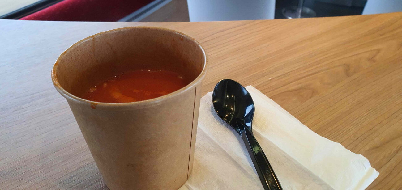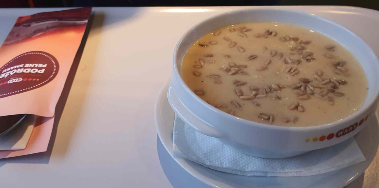 Po ranní zkušenosti s polským vozem musím ocenit, že v jídelní části i v kupéčku je příjemně teplo. Cena za kelímek rajské polévky (Zupa pomidorowa) s plastovou lžíci je 107 Kč.