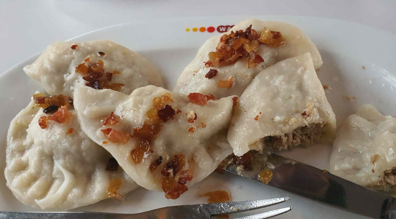 Já si konečně dávám tradiční polské jídlo: Pirohy s masem a omastkem (pirohy s masem, slanina, cibule) Bohužel hned po prvním soustu jsem zklamaný. Pirohy se doslova topí v mastnotě, a to tak, že si omastek odlévám do prázdného talíře od polévky. Ani to však nepomáhá. Cítím chuť pepře a jakéhosi no-name koření, které naprosto přebíjí chuť mletého masa i samotného těsta, které se úplně ztrácejí. Koření je tolik, že se o nějaké chuti nedá vůbec mluvit. Možná kdyby k tomu byl zeleninový salát… Udělal jsem to, co už dlouho ne — a jídlo odkládám. Tohle se opravdu nedá jíst. Cena těchto piroh 191 Kč.