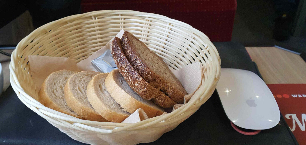 Obsluha přichází snad až za dvacet (!) minut, co tam sedím, a přináší mi papírové menu. Radši si ihned objednávám: frankfurtské párky se zeleninovou přílohou a pečivem. K tomu džus. Tři nožičky párků jsou dobré, tam není co zkazit. Příloha mi moc chutná – je to dobře uleželý zeleninový salát. K těm párkům se hodí. Plus sladký kečup a hořčice, která není ostrá. V ošatce na pečivo je světlý a tmavý chléb a máslo. K jídlu nemám připomínky, není ostré a je vhodné i pro děti. Jako vydatná snídaně dobrý.