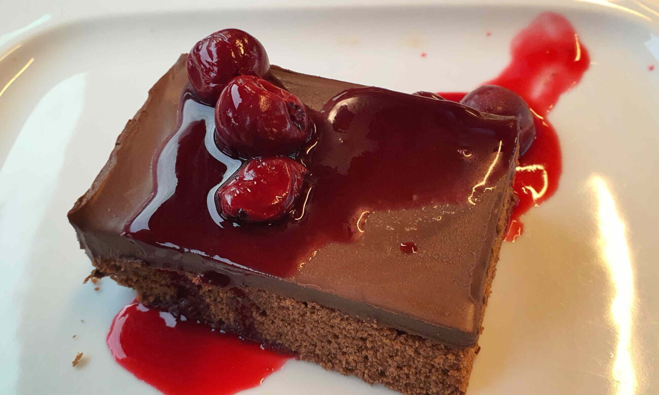 Koláč mi obsluha přináší během pěti minut. Talíř je pokojové teploty, v papírovém sáčku je vidlička a velký šedý ubrousek. Višně jsou příjemně ohřáté, sladké tak akorát, se šťávou, která se krásně doplňuje s hutnou vrstvou kvalitní čokolády na hranatém koláči. Těsto drží pohromadě, nedrobí se, chuťově výborné.