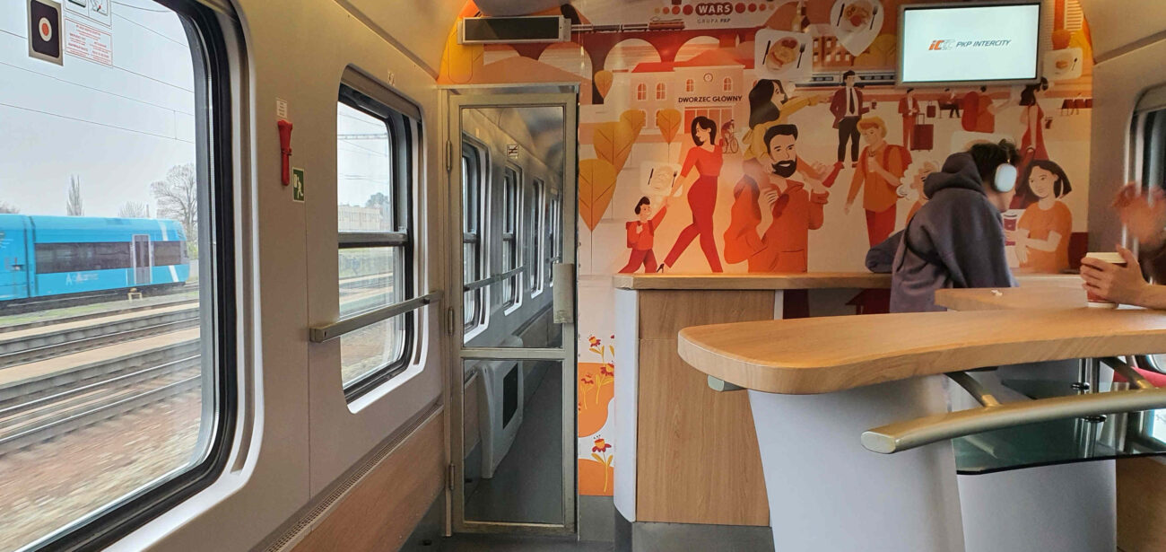 Expres Polonia odjíždí z Přerova na čas v 11:49. Protože do Břeclavi je to jen hodina cesty a po špatné zkušenosti z dnešního rána jdu hned do jídelního vozu, který je řazen jako předposlední vůz před vozem 1. třídy, který soupravu uzavírá. Jídelní vůz provozuje opět polský WARS. Překvapuje mne uspořádání jídelního prostoru. Žádné židle, jen zahnuté stoly na stojáka. U barového pultu jsou tři barové stoličky. Takže se nejedná o klasický jídelní vůz, ale o vůz barový. Navíc jídelní část zabírá jen polovinu vozu, v druhé části jsou kupéčka.