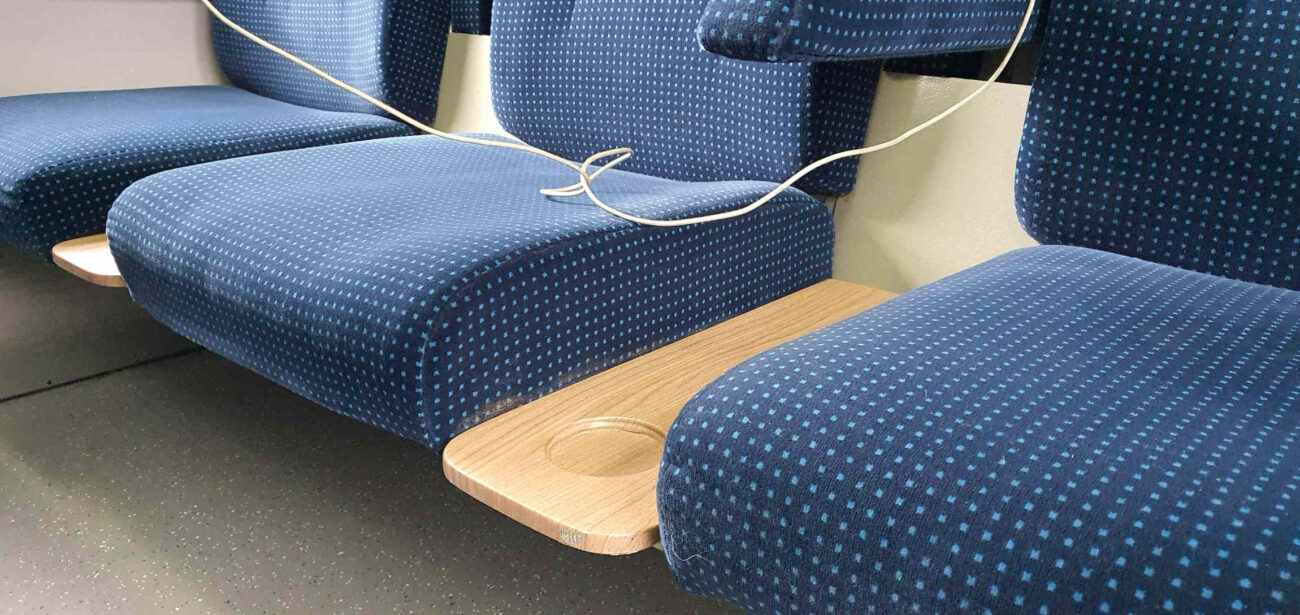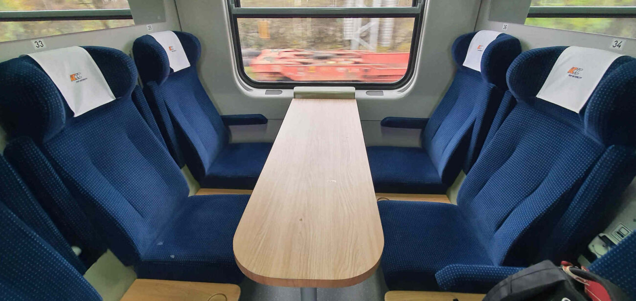 V oddíle je dominantní dřevěný stůl tak, aby i ti, co sedí u dveří do uličky, si mohli jídlo odložit na stůl. Na kávu či další nápoje jsou prohlubně mezi sedadly, pod opěrkami. Bohužel, jak je kupéčko využíváno k jídlu, než položím notebook na stůl, musím stůl setřít kapesníkem od zbytků cukru a nějaké rozlité (vyrosené) vody. Přestože jsou tu jen tři sedadla vedle sebe, kvůli místu mezi nimi jsou sedadla hodně těsná. Asi jsou opravdu pro hubenější lidi, nebo už budu muset zhubnout. Pokud sedíte u dveří do uličky a jste pravák, máte problém – musíte se natočit.