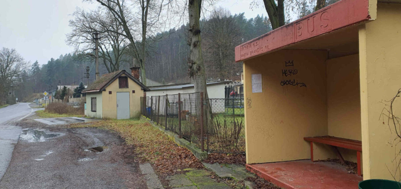 Lavička pod přístřeškem a hlášení staničního rozhlasu