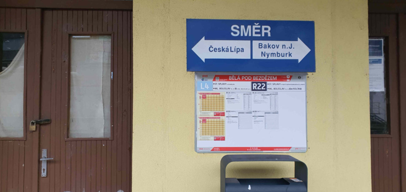 - Po dvou minutách chůze od nádraží se nachází přístřešek autobusové zastávky „Bělá p. Bezd., Nádražní“.