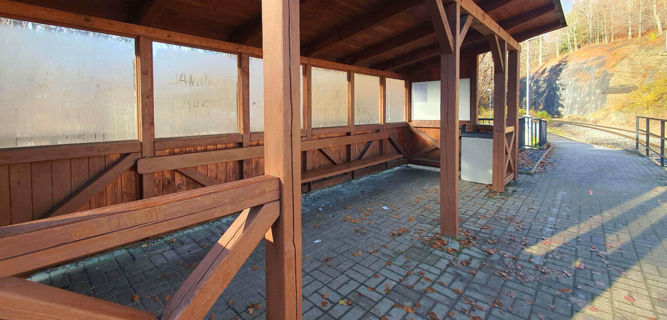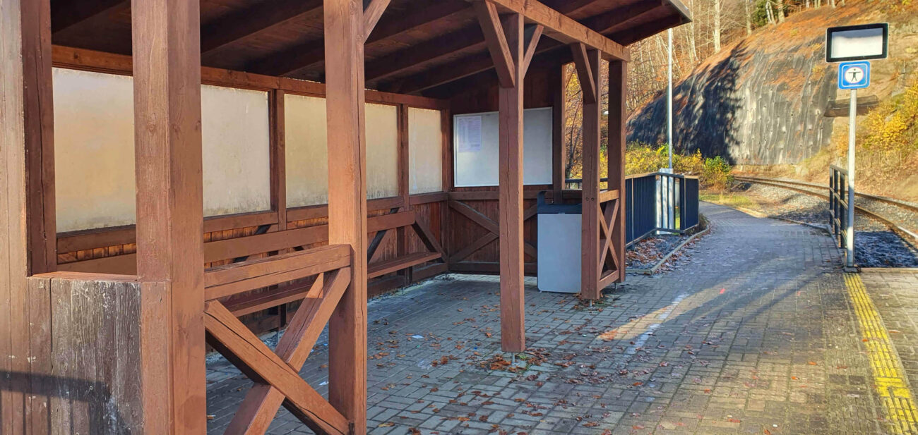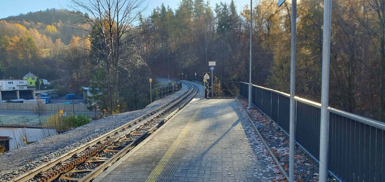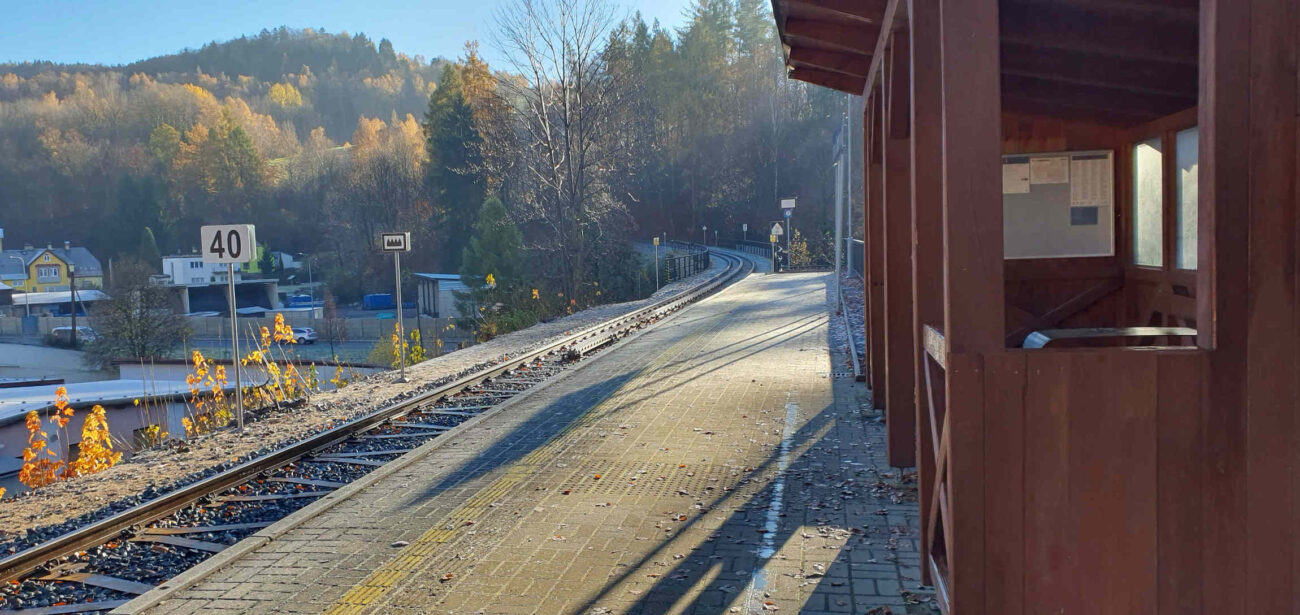 Škoda, že dole u cesty k zastávce není nějaká směrovka. Druhá moje připomínka se týká krátkého nástupiště, kvůli kterému lze u delších vlaků v této zastávce vystupovat pouze z prvního vozu. Bohužel hlášení o tom, že se otevřou dveře jen v prvním voze, zaznívá až těsně před zastávkou, což může být pro některé cestující pozdě.