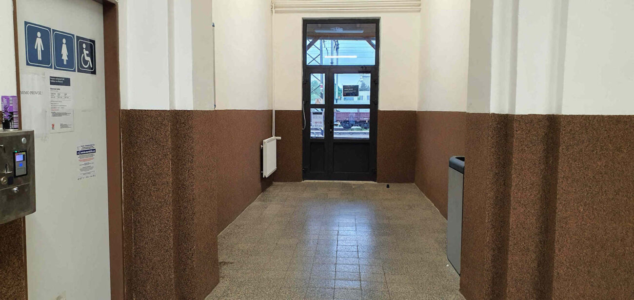 - U východu z čekárny a od pokladen jsou žluté označovače jízdenek a nad dveřmi odjezdová tabule vlaků.