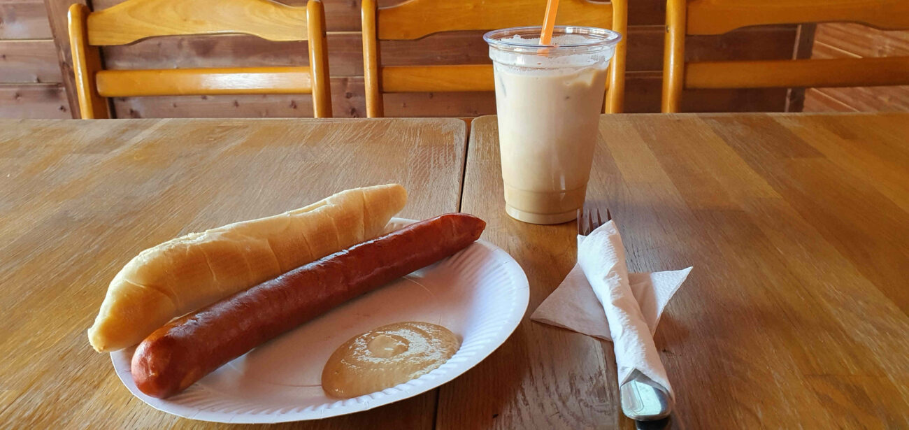 Uzený párek s rohlíkem a hořčicí a k tomu velké sladké ledové kafe – na tom se nedá nic zkazit, žádná vysoká gastronomie. Ale rohlík byl křupavý a párek dobrý. A ledová káva mi v ten den opravdu bodla. Díky tomu, že byla v plastovém kelímku, jsem si jej dopíjel ještě ve vlaku. Ze záběrů to není vidět, ale za mnou byli další hosté a venku, kolem svých kol, popíjeli cyklisté po výletě pivo, čekaje na stejný rychlík do Brna jako já.