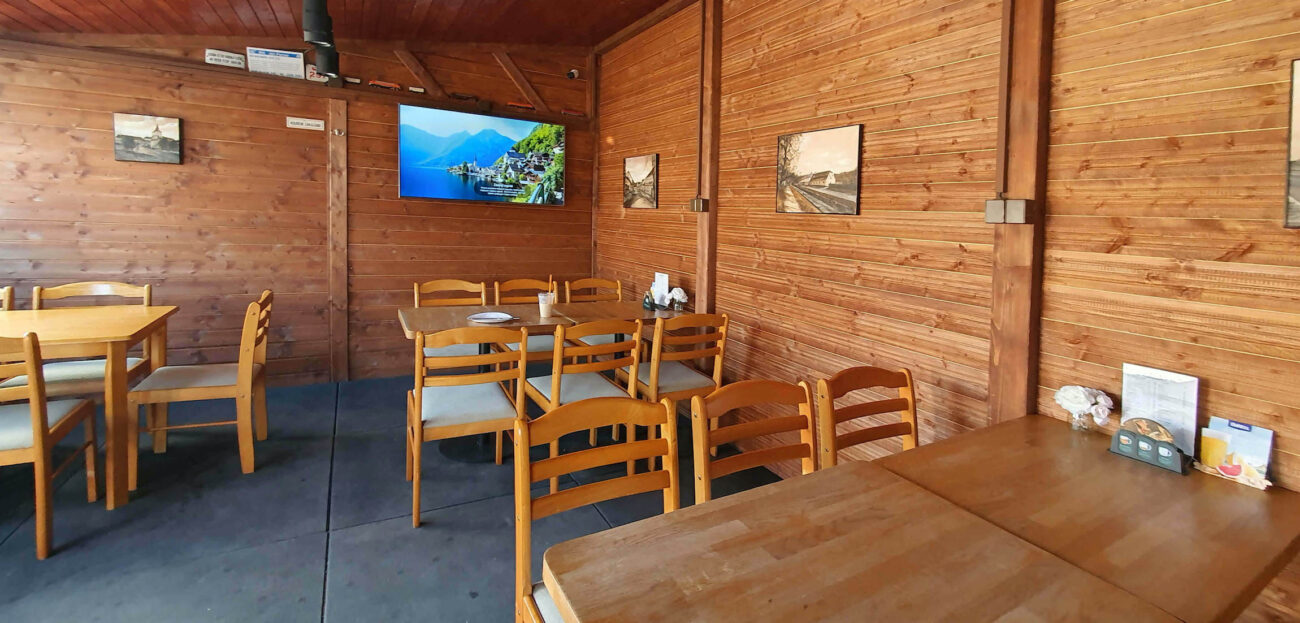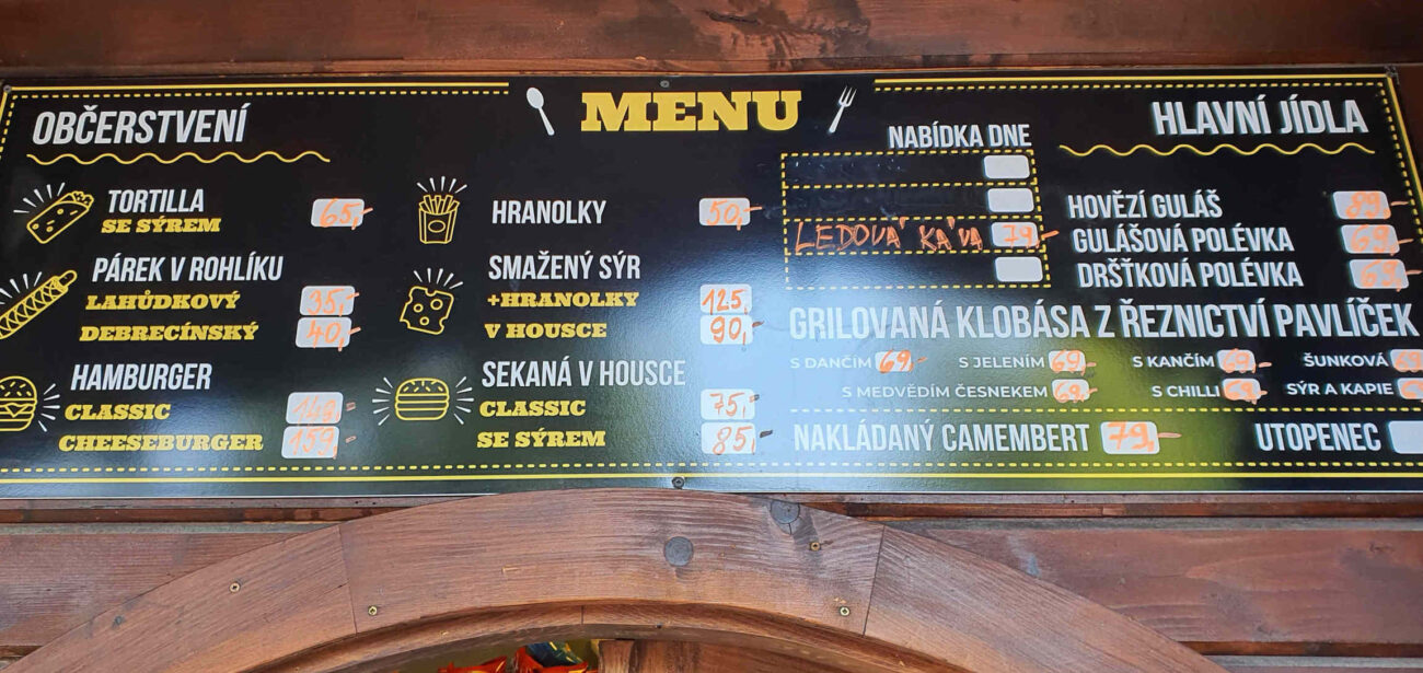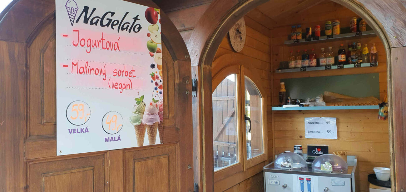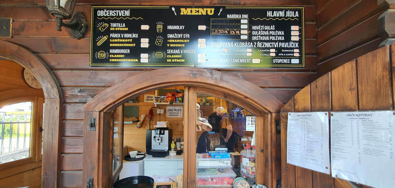 Jsou tu dvě dřevěné stavby. Ta první slouží k objednávání a přípravě jídel. Otevřené dveře teď v létě lákají na zmrzlinu. Já využil nabídky u okénka. To, co se objednává nejčastěji, máte vypsané nahoře na černé tabuli nad okénkem. Kompletní nápojový a jídelní lístek je vpravo na okenicích. Když je teplo jako dnes, můžete sedět venku na lavicích. Já ale využil druhé dřevěné stavby – „jídelny“.
