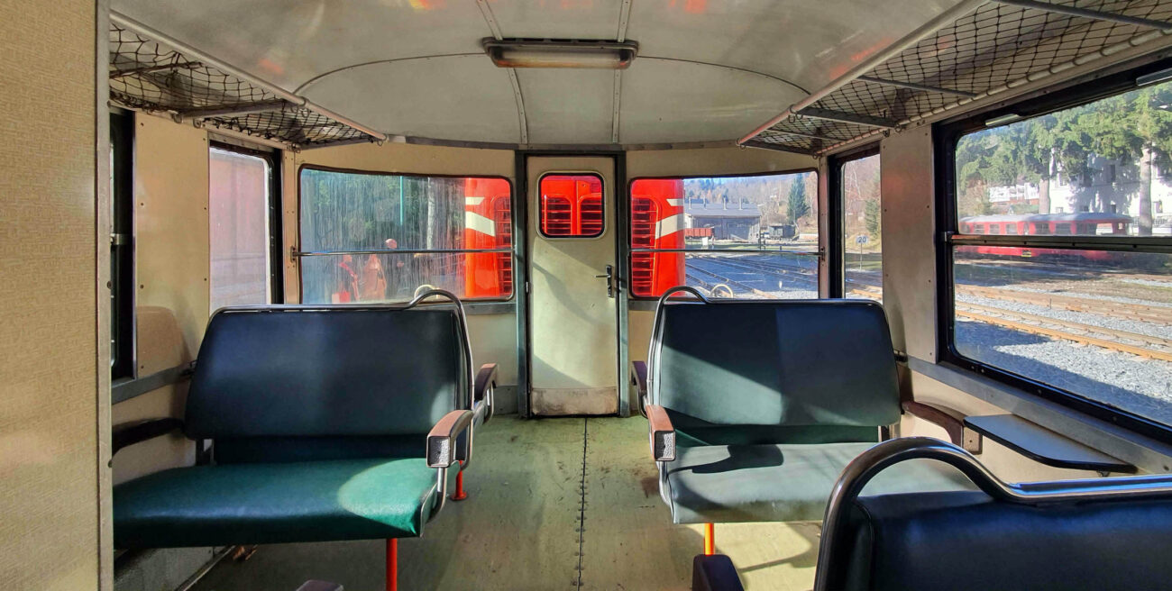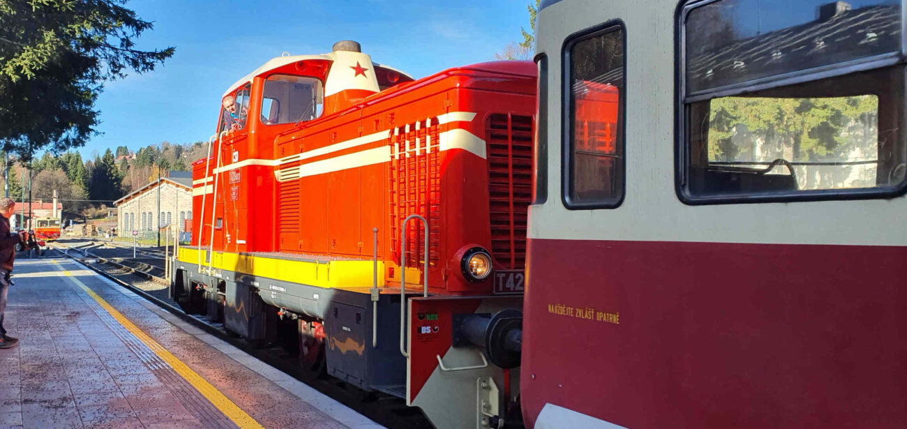 My jsme měli možnost jet osobním vlakem taženým právě Rakušankou. Její název je odvozen od země původu – Rakouska, kde byly tyto lokomotivy v roce 1961 vyrobeny v počtu čtyř kusů pro tehdejší ČSD. Rozpis jízd starými vlaky je na stránkách spolku.  Za „Rakušankou“ jsou řazeny osobní vozy typu Balm.